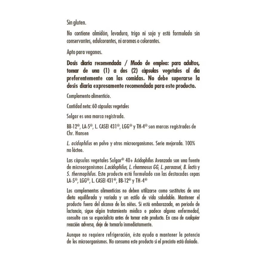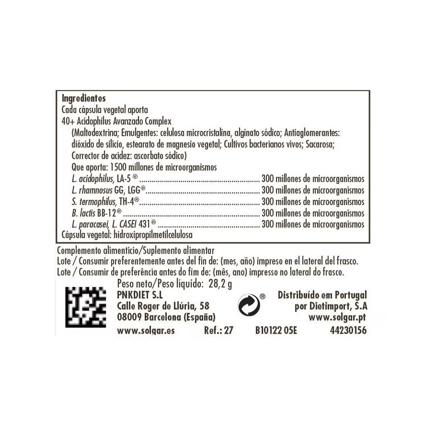 40+ Acidophilus Avanzado Complex (Maltodextrina; Emulgentes: celulosa microcristalina, alginato sódico; Antiaglomerantes: dióxido de silicio, estearato de magnesio vegetal; Cultivos bacterianos vivos; Sacarosa; Corrector de acidez: ascorbato sódico) Que aporta: L. acidophilus, LA-5 ®; L. rhamnosus GG, LGG®; S. termophilus, TH-4®; B. lactis, BB-12®; L. paracasei, L. CASEI 431®; Cápsula vegetal: hidroxipropilmetilcelulosa.