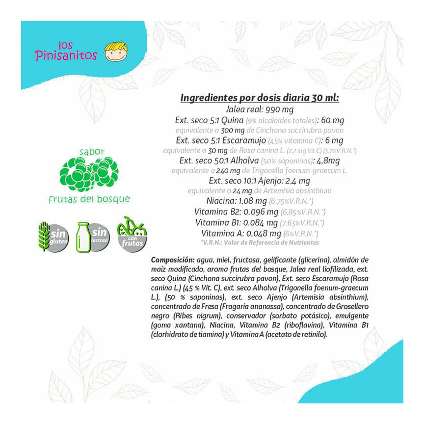 EAN: 8435001000698Este Pinisanito ¡A comer! ha sido especialmente formulado pensando en los más pequeños. Su composición contiene extractos de plantas (quina, escaramujo, alholva y a...... leer másAñadir al carritoA COMER pinisanitos 250ml PINISANEste Pinisanito ¡A comer! ha sido especialmente formulado pensando en los más pequeños. Su composición contiene extractos de plantas (quina, escaramujo, alholva y ajenjo) y productos naturales especialmente seleccionados por la calidad de los nutrientes que aportan, como la jalea real y la miel . Así, disfrutando de su delicioso sabor a frutas del bosque, los peques se lo comerán todo, a la vez que ayudan a una buena nutrición de su organismo.