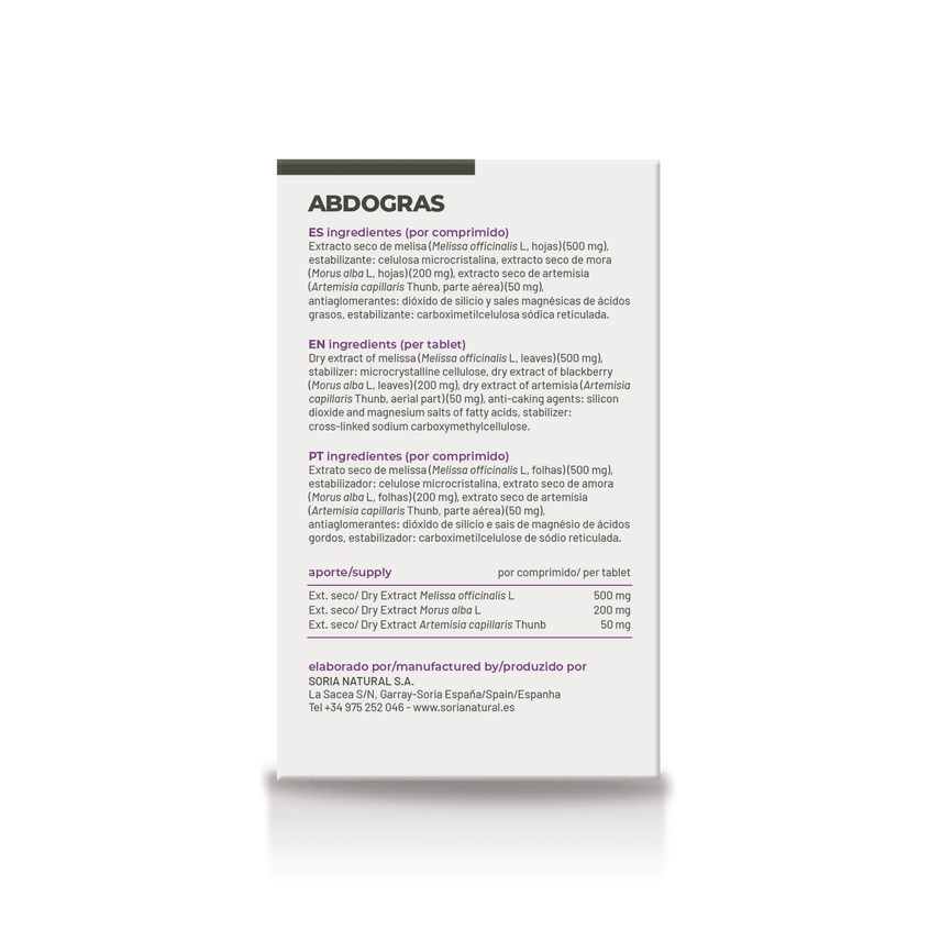 Abdográs está elaborado con extracto de melisa, mora y artemisa, que actúan sobre el metabolismo y movilización de la grasa corporal, principalmente a nivel abdominal, ayudando a reducir su acumulación y localización.