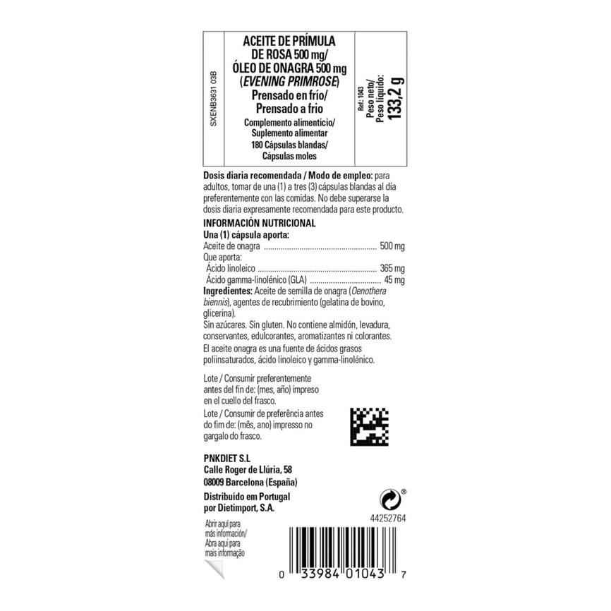 Con 500 mg de aceite de onagra por cápsula, este producto contiene en su composición un alto porcentaje de GLA (ácido gamma linoleico), un ácido graso de la serie omega 6 que tradicionalmente se ha asociado al bienestar de la mujer.