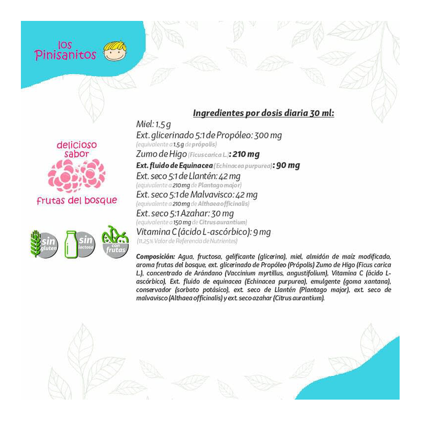 EAN: 8435001000490Este Pinisanito ¡adiós, pañuelos!, ha sido especialmente desarrollado pensando en los más pequeños. Su composición está formulada base de extra...... leer másAñadir al carritoADIOS PAÑUELOS 250ml PINISANEste Pinisanito ¡adiós, pañuelos!, ha sido especialmente desarrollado pensando en los más pequeños. Su composición está formulada base de extractos de plantas y otros productos naturales, como la miel y el propóleo, que producen las abejas. También contiene vitamina C que contribuye al funcionamiento normal del sistema inmunitario. Además su delicioso sabor a frutas del bosque, hace que olvidarse de los pañuelos, sea mucho más divertido para los peques.