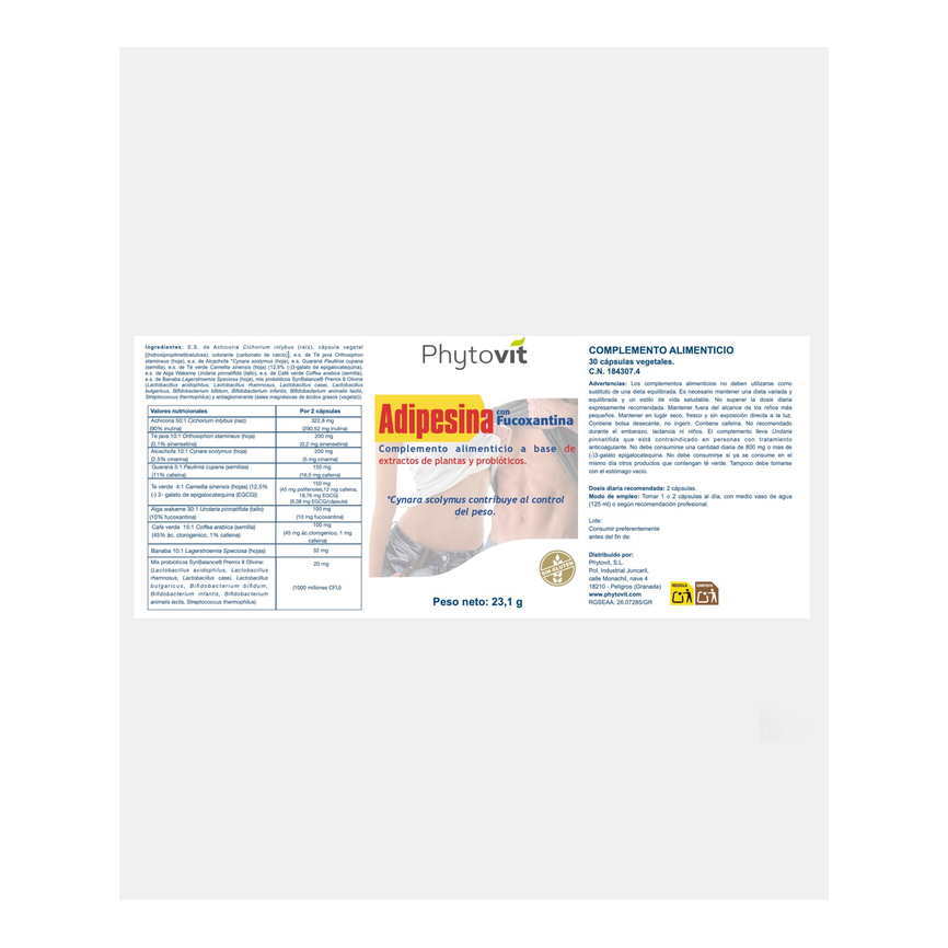 E.S. de Achicoria Cichorium intybus (raíz), cápsula vegetal [(hidroxipropilmetilcelulosa), colorante (carbonato de calcio)], E.S. de Té java Orthosiphon sta...... leer másAñadir al carritoADIPESINA 30cap. PHYTOVITE.S. de Achicoria Cichorium intybus (raíz), cápsula vegetal [(hidroxipropilmetilcelulosa), colorante (carbonato de calcio)], E.S. de Té java Orthosiphon stamineus (hoja), E.S. de Alcachofa *Cynara scolymus (hoja), E.S. Guaraná Paullinia cupana (semilla), E.S. de Té verde Camellia sinensis (hoja) (12,5% (-)3-galato de epigalocatequina), E.S. de Alga Wakame Undaria pinnatifida (tallo), E.S. de Café verde Coffea arabica (semilla), E.S. de Banaba Lagerstroemia Speciosa (hoja), mix probióticos SynBalance® Premix 8 Olivine (Lactobacillus acidophilus, Lactobacillus rhamnosus, Lactobacillus casei, Lactobacillus bulgaricus, Bifidobacterium bifidum, Bifidobacterium infantis, Bifidobacterium animalis lactis, Streptococcus thermophilus) y antiaglomerante (sales magnésicas de ácidos grasos (vegetal)).