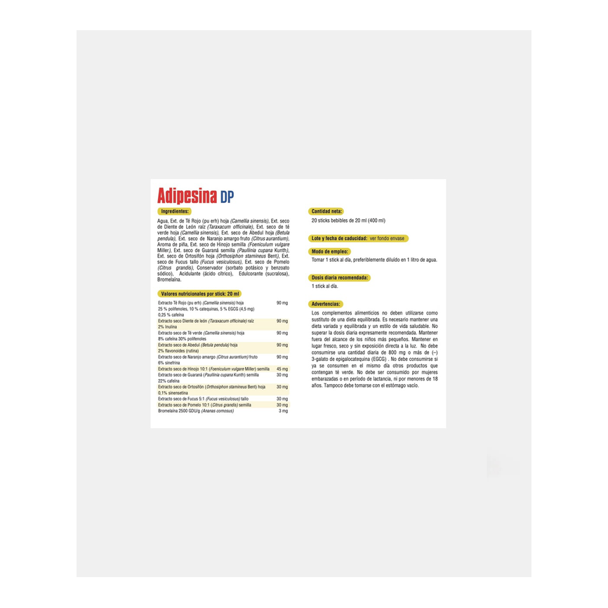 Agua, extracto seco de Té rojo (pu erh) (hoja) (Camellia sinensis), extracto seco de Diente de león (raíz) (Taraxacum officinale), extracto seco de Té verde (hoja)&...... leer másAñadir al carritoADIPESINA DP 20 sticks bebibles de 20 ml. PHYTOVITAgua, extracto seco de Té rojo (pu erh) (hoja) (Camellia sinensis), extracto seco de Diente de león (raíz) (Taraxacum officinale), extracto seco de Té verde (hoja) (Camellia sinensis), extracto seco de Abedul (hoja) (Betula pendula), extracto seco de Naranjo amargo (fruto) (Citrus aurantium), aroma de piña, extracto seco de Hinojo (semilla) (Foeniculum vulgare Miller), extracto seco de Guaraná (semilla) (Paullinia cupana Kunth), extracto seco de Ortosifón (hoja) (Orthosiphon stamineus Bent), extracto seco de Fucus (tallo) (Fucus vesiculosus), extracto seco de Pomelo (Citrus grandis), conservador (sorbato potásico y benzoato sódico), acidulante (ácido citrico), edulcorante (sucralosa), bromelaína.