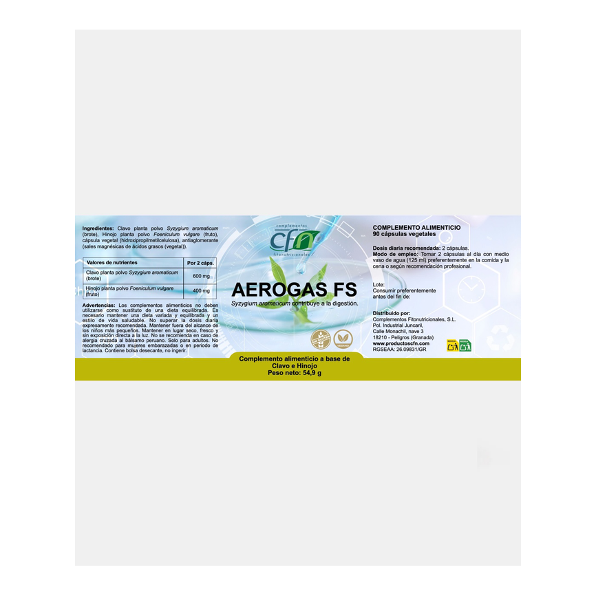 Clavo planta polvo Syzygium aromaticum (brote), Hinojo planta polvo Foeniculum vulgare (fruto), cápsula vegetal (hidroxipropilmetilcelulosa), antiaglomerante (sales magn&...... leer másAñadir al carritoAEROGAS FS 60cap. CFNClavo planta polvo Syzygium aromaticum (brote), Hinojo planta polvo Foeniculum vulgare (fruto), cápsula vegetal (hidroxipropilmetilcelulosa), antiaglomerante (sales magnésicas de ácidos grasos(vegetal)).