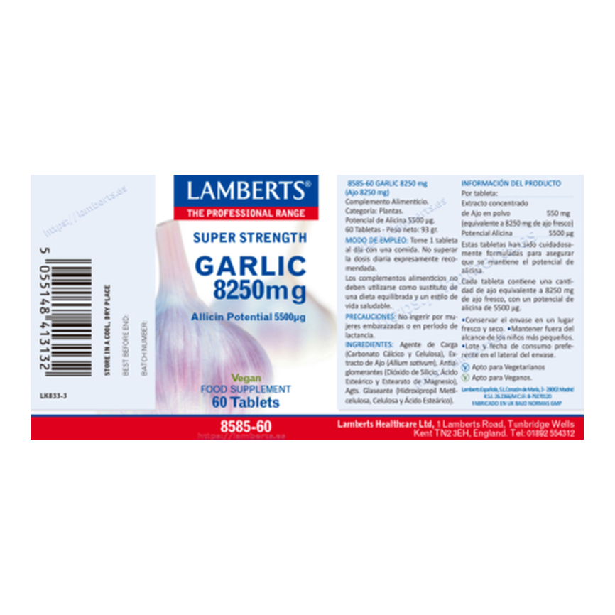 EAN: 5055148413132Ajo 8250 mg Aportando 5500 µg de Alicina Tome 1 tableta al día con comida. No superar la dosis diaria expresamente recomendada ... leer másAñadir al carritoAJO 8250mg. 60comp. LAMBERTSAjo 8250 mg