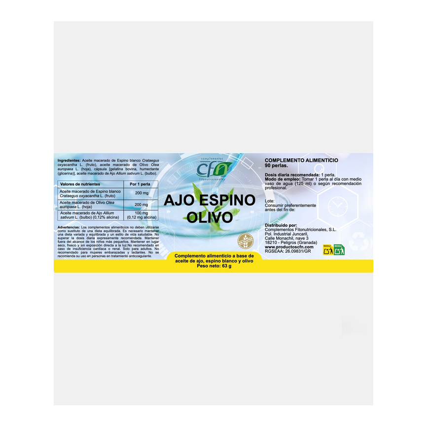 EAN: 8436608680719Aceite macerado de Espino blanco Crataegus oxyacantha L. (fruto), aceite macerado de Olivo Olea europaea L. (hoja), cápsula [gelatina bovina, humectante (glicerina)]...... leer másAñadir al carritoAJO ESPINO OLIVO 90perlas. CFNAceite macerado de Espino blanco Crataegus oxyacantha L. (fruto), aceite macerado de Olivo Olea europaea L. (hoja), cápsula [gelatina bovina, humectante (glicerina)], aceite macerado de Ajo Allium sativum L. (bulbo).