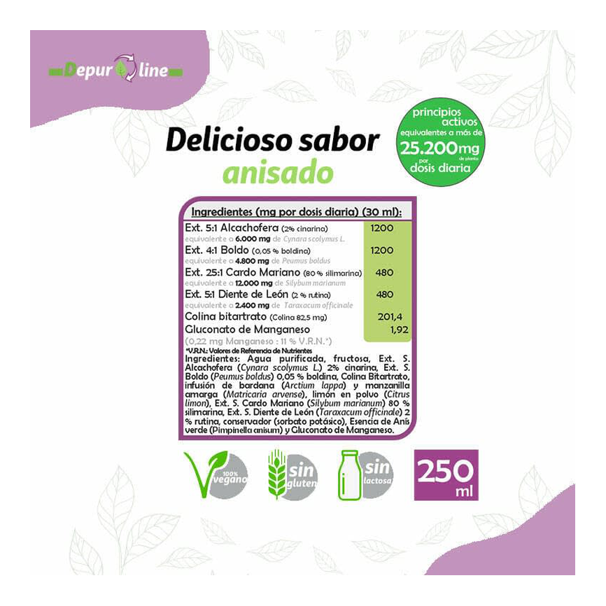 Las plantas utilizadas en la composición de este producto: el boldo, la alcachofa, el diente de león, el cardo santo, la bardana y la manzanilla amarga, cuentan con importantes principios amargos. Sin embargo, una cuidadosa formulación da como resultado un producto con un delicioso sabor anisado, del que también se puede disfrutar tras una comida copiosa. Además su fórmula está enriquecida con manganeso y colina que contribuye a mantener la función hepática normal. Su potente formulación aporta principios activos equivalentes a 25.200 mg por dosis diaria. También lo puedes disfrutar tras una comida copiosa.