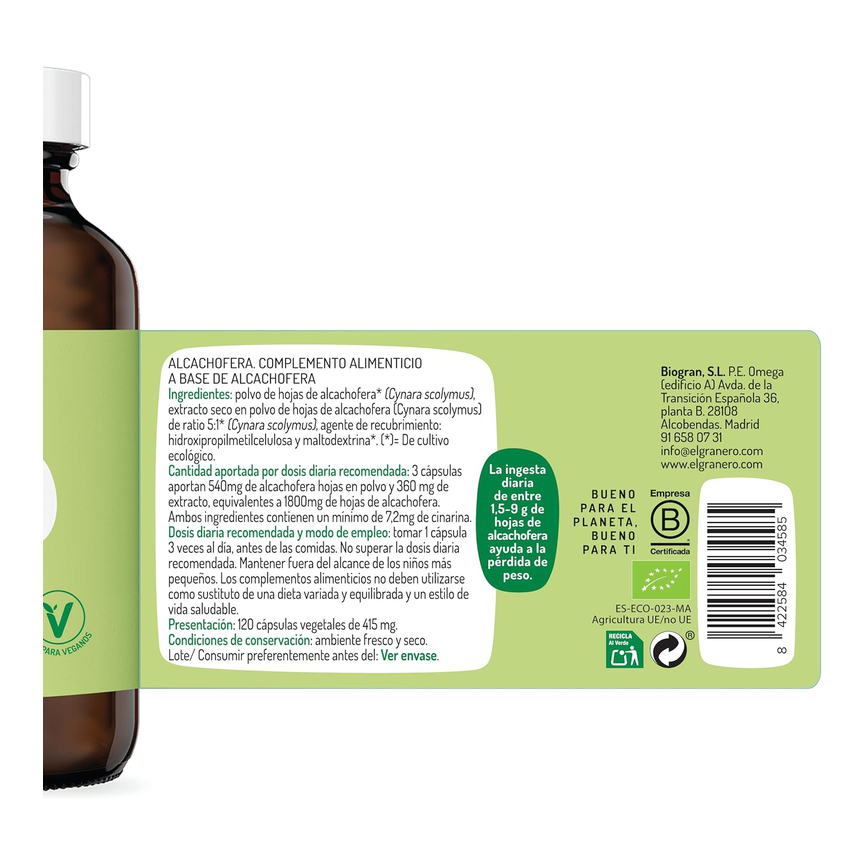 EAN: 8422584034585La Alcachofera Bio de El Granero Integral es un complemento alimenticio que destaca por la presencia de vitamina B1, niacina y vitamina C. Además, es muy rica en Potasio, Magnesio, enzimas e...... leer másAñadir al carritoALCACHOFERA BIO 120caps. EL GRANEROLa Alcachofera Bio de El Granero Integral es un complemento alimenticio que destaca por la presencia de vitamina B1, niacina y vitamina C. Además, es muy rica en Potasio, Magnesio, enzimas e inulina. Esta última es un oligosacárido derivado de la sacarosa (hidrato de carbono) que se metaboliza lentamente en el organismo manteniendo los niveles normales de glucosa en sangre.