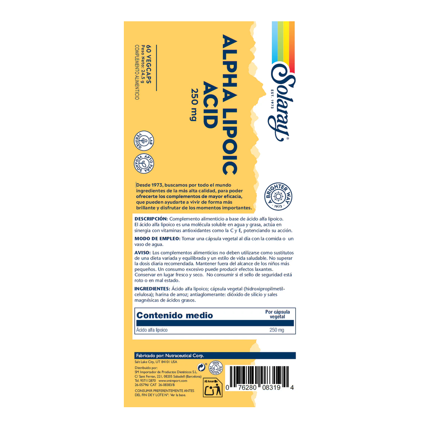 ALPHA LIPOIC ACID 250mg. 60cap. SOLARAY