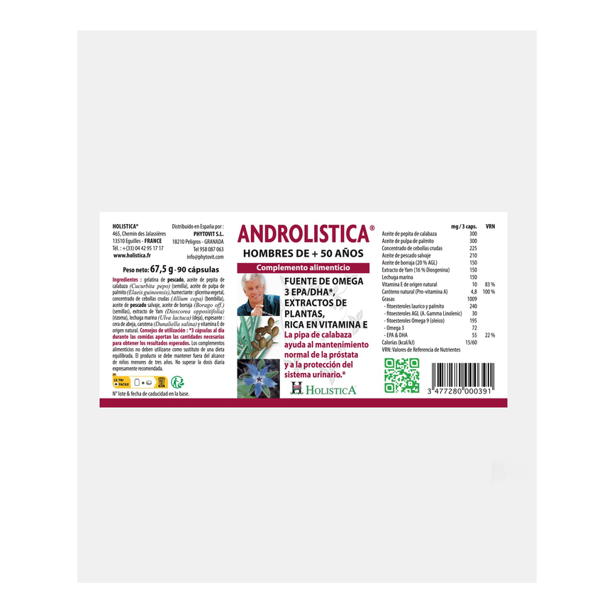 Gelatina de pescado, aceite de pepita de calabaza (Cucurbita pepo) (semilla), aceite de pulpa de palmito (Elaeis guineensis), humectante: glicerina vegetal, concentrado de cebollas crudas...... leer másAñadir al carritoANDROLISTICA® 90 cápsulas. PHYTOVITGelatina de pescado, aceite de pepita de calabaza (Cucurbita pepo) (semilla), aceite de pulpa de palmito (Elaeis guineensis), humectante: glicerina vegetal, concentrado de cebollas crudas (Allium cepa) (bombilla), aceite de pescado salvaje, aceite de borraja (Borago off.) (semillas), extracto de Yam (Dioscorea oppositifolia) (rizoma), lechuga marina (Ulva lactuca) (deja), espesante: cera de abeja, carotena (Dunaliella salina) y vitamina E de origen natural.