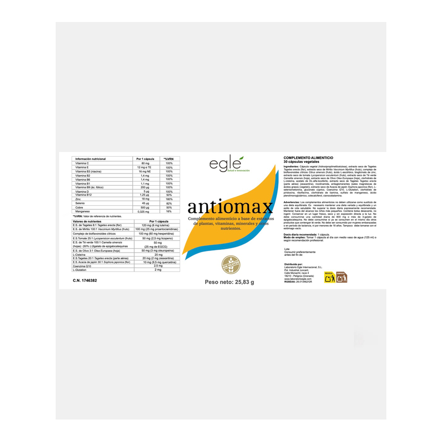 EAN: 686-0009Cápsula vegetal (hidroxipropilmetilcelulosa), extracto seco de Tagetes Tagetes erecta (flor), extracto seco de Mirtilo Vaccinium Myrtillus (fruto),complejo de bioflavonoi...... leer másAñadir al carritoANTIOMAX 30cap. EGLECápsula vegetal (hidroxipropilmetilcelulosa), extracto seco de Tagetes Tagetes erecta (flor), extracto seco de Mirtilo Vaccinium Myrtillus (fruto),complejo de bioflavonoides cítricos Citrus sinensis (fruto), ácido L-ascórbico, bisglicinato de zinc, extracto seco de tomate Lycopersicon esculentum (fruto),extracto seco de Té verde Camellia sinensis (hoja), extracto seco de Olivo Olea Europaea (hoja), clorhidrato de L-cisteína, acetato de DL-alfa-tocoferilo, extracto seco de Tagetes Tagetes erecta (parte aérea) (zeaxantina), nicotinamida,antiaglomerantes (sales magnésicas de ácidos grasos (vegetal)), extracto seco de Acacia de japón Sophora japonica (flor), L-seleniometionina, gluconato cúprico,Coenzima Q10, L-Glutation, clorhidrato de piridoxina, riboflavina, clorhidrato de tiamina, sulfato de manganeso, ácido pteroilmonoglutámico, colecalciferol, cianocobalamina.