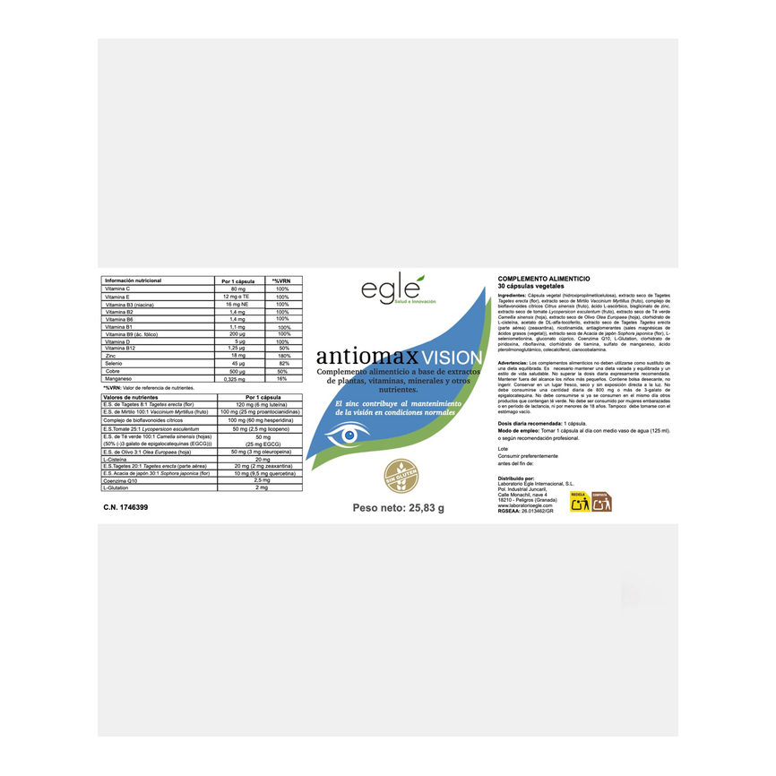 EAN: 686-0010Cápsula vegetal (hidroxipropilmetilcelulosa), extracto seco de Tagetes Tagetes erecta (flor), extracto seco de Mirtilo Vaccinium Myrtillus (fruto), complejo de bioflavono...... leer másAñadir al carritoANTIOMAX VISION 30cap. EGLÉCápsula vegetal (hidroxipropilmetilcelulosa), extracto seco de Tagetes Tagetes erecta (flor), extracto seco de Mirtilo Vaccinium Myrtillus (fruto), complejo de bioflavonoides cítricos Citrus sinensis (fruto), ácido L-ascórbico, bisglicinato de zinc, extracto seco de tomate Lycopersicon esculentum (fruto), extracto seco de Té verde Camellia sinensis (hoja), extracto seco de Olivo Olea Europaea (hoja), clorhidrato de L-cisteína, acetato de DL-alfa-tocoferilo, extracto seco de Tagetes Tagetes erecta (parte aérea) (zeaxantina), nicotinamida, antiaglomerantes (sales magnésicas de ácidos grasos (vegetal)), extracto seco de Acacia de japón Sophora japonica (flor), L-seleniometionina, gluconato cúprico, Coenzima Q10, L-Glutation, clorhidrato de piridoxina, riboflavina, clorhidrato de tiamina, sulfato de manganeso, ácido pteroilmonoglutámico, colecalciferol, cianocobalamina.