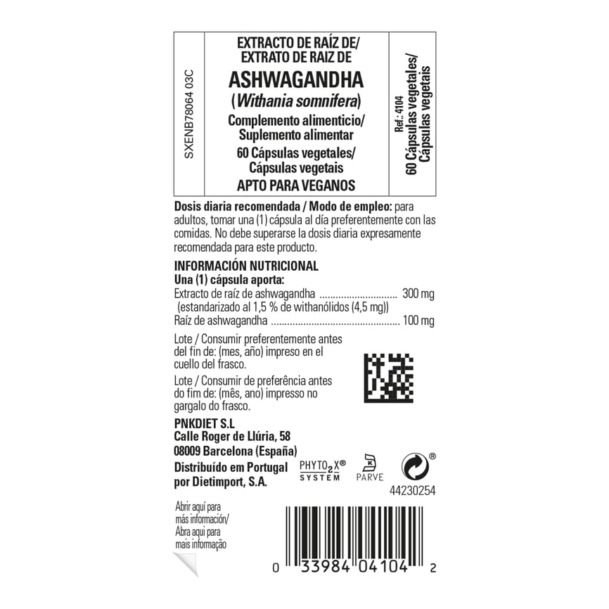Extracto de raíz de ashwagandha (Withania somnifera), raíz de ashwagandha (Withania somnifera) en polvo, agente de recubrimiento (hidroxipropilmetilcelulosa), agente de carga (celulosa microcristalina), antiaglomerantes (estearato de magnesio, ácido esteárico, óxido de magnesio), antioxidantes (betacaroteno, ácido L-ascórbico).