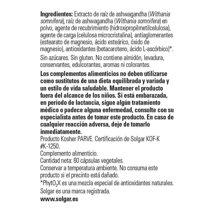 ASHWAGANDA Extracto de Raíz. (withania somnifea) 60vcaps. SOLGAR