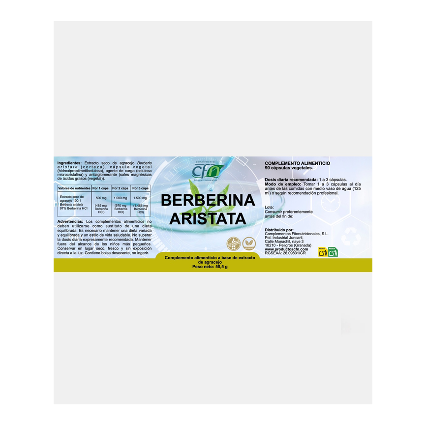 Extracto seco de agracejo Berberis aristata (corteza) , cápsula vegetal (hidroxipropilmetilcelulosa), agente de carga (celulosa microcristalina) y antiaglomerante (sales magn&eacut...... leer másAñadir al carritoBERBERINA ARISTATA 90cap. CFNExtracto seco de agracejo Berberis aristata (corteza) , cápsula vegetal (hidroxipropilmetilcelulosa), agente de carga (celulosa microcristalina) y antiaglomerante (sales magnésicas de ácidos grasos (vegetal)).