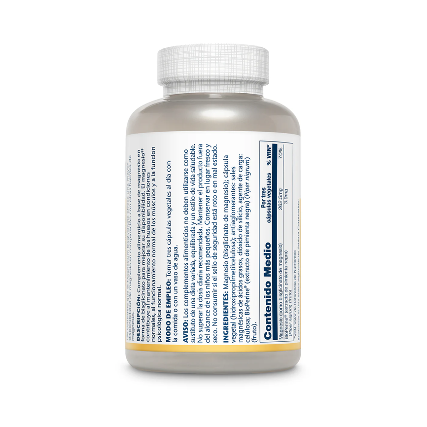 Composición:Magnesio (bisglicinato de magnesio); cápsula vegetal (hidroxipropilmetilcelulosa); antiaglomerantes: sales magnésicas de ácidos grasos, dióxido de silicio, agente de carga: celulosa; BioPerine® (extracto de pimienta negra) (Piper nigrum) (fruto).