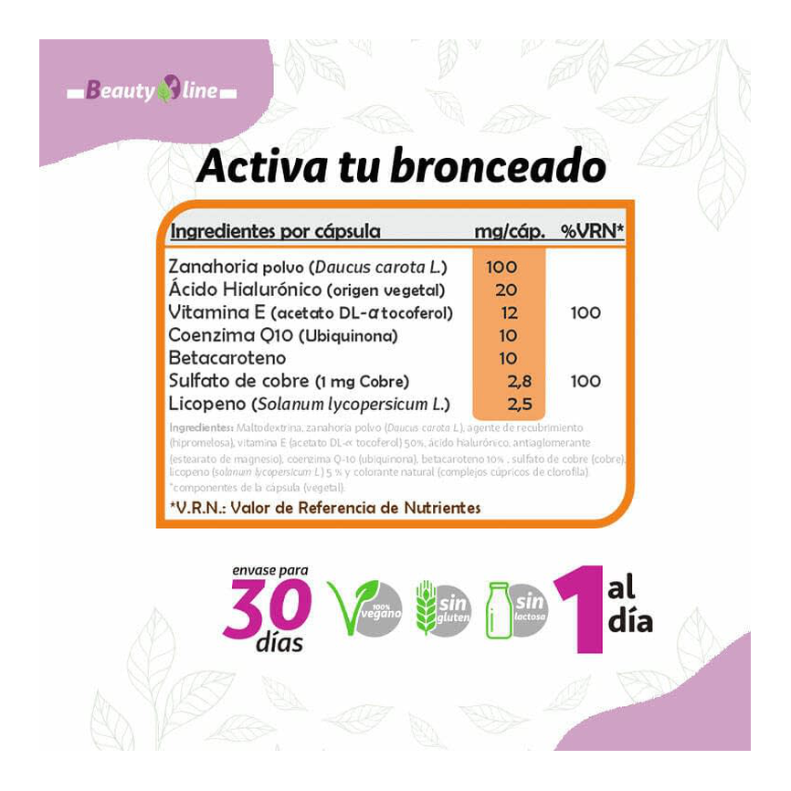 Fórmula con Betacaroteno, Licopeno, Zanahoria, Ácido Hialurónico, Q10, Vitamina E y Cobre, que contribuye a la normal pigmentación de la piel.