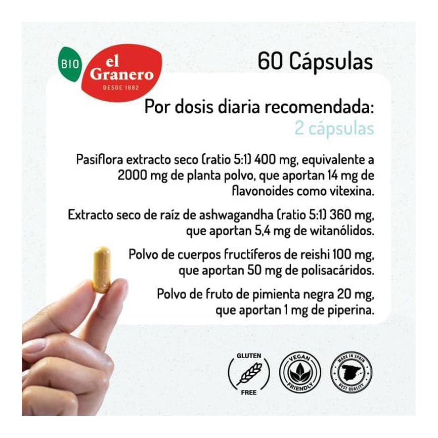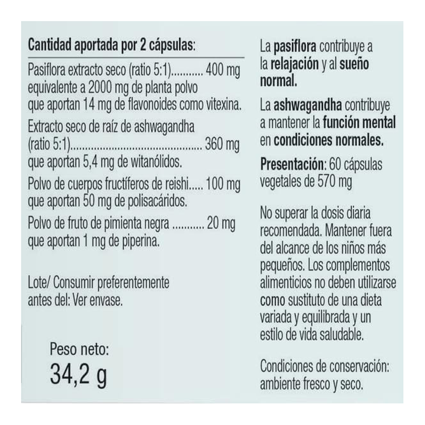 Composición:Pasiflora parte aérea extracto seco (Passiflora incarnata L.), extracto seco de raíz de ashwagandha (Withania Somnifera (L.) Dunal), agente de recubrimiento hidroxipropilmetilcelulosa, polvo de cuerpos fructíferos de reishi (Ganoderma lucidum), celulosa microcristalina, polvo de fruto de pimienta negra (Piper nigrum L), antiaglomerante: sales magnésicas de ácidos grasos y maltodextrina.