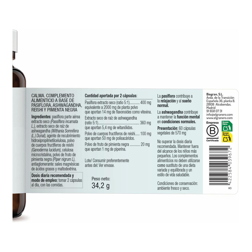 Calma El Granero combina tres ingredientes botánicos conocidos por su acción sinérgica sobre el sistema nervioso: pasiflora, ashwagandha y reishi. Esta fórmula está diseñada para aportar equilibrio y relajación ante el ritmo de vida actual, ayudando a gestionar mejor el estrés emocional y físico.