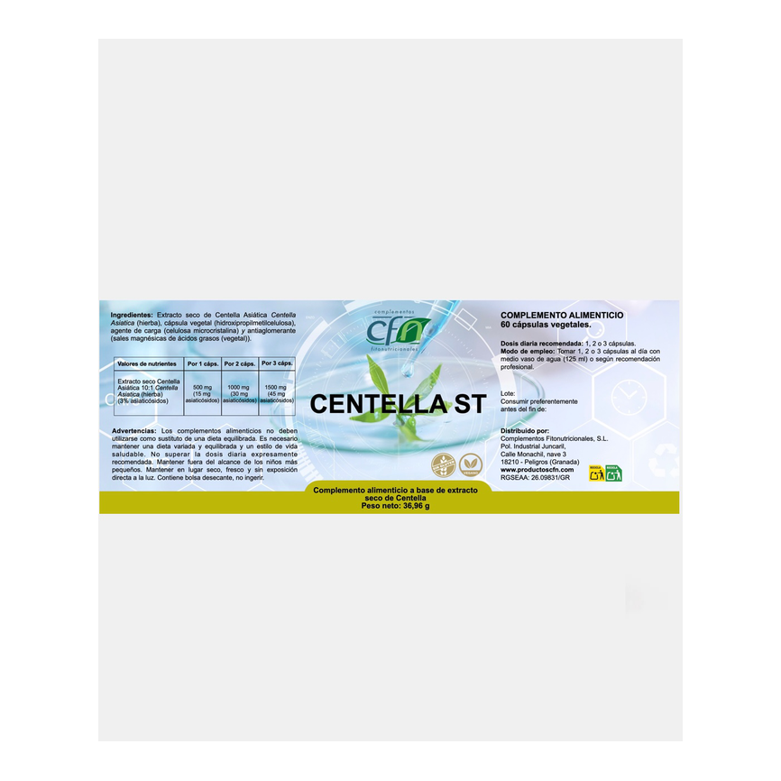 EAN: CFN-016Extracto seco de Centella Asiática Centella Asiatica (hierba), cápsula vegetal (hidroxipropilmetilcelulosa), agente de carga (celulosa microcristalina) y anti...... leer másAñadir al carritoCENTELLA ASIATICA ST 60 cap. CFNExtracto seco de Centella Asiática Centella Asiatica (hierba), cápsula vegetal (hidroxipropilmetilcelulosa), agente de carga (celulosa microcristalina) y antiaglomerante (sales magnésicas de ácidos grasos (vegetal)).