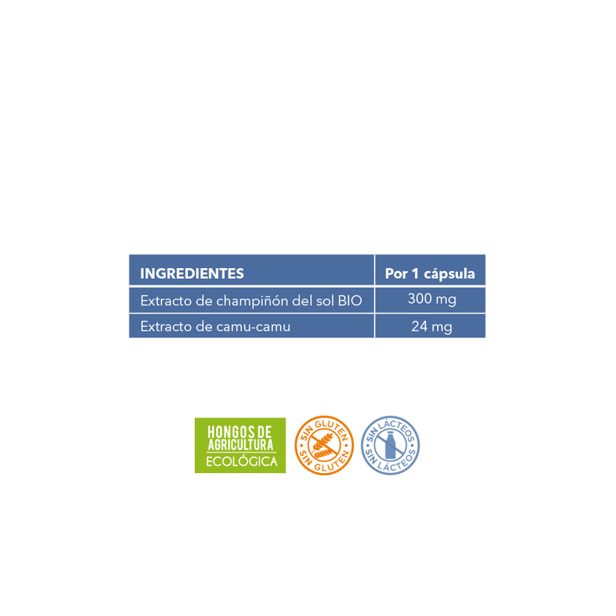 Composición:Extracto seco de champiñón del sol* (Agaricus blazei Murill) estandarizado al 15% en betaglucanos 300 mg, agente de carga (celulosa), agente de recubrimiento vegetal (hidroxipropilmetilcelulosa), estabilizante (hidroxipropilmetilcelulosa), extracto de camu-camu (Myrciaria dubia) estandarizado al 50% en vitamina C 24 mg, agente de carga (xilitol).