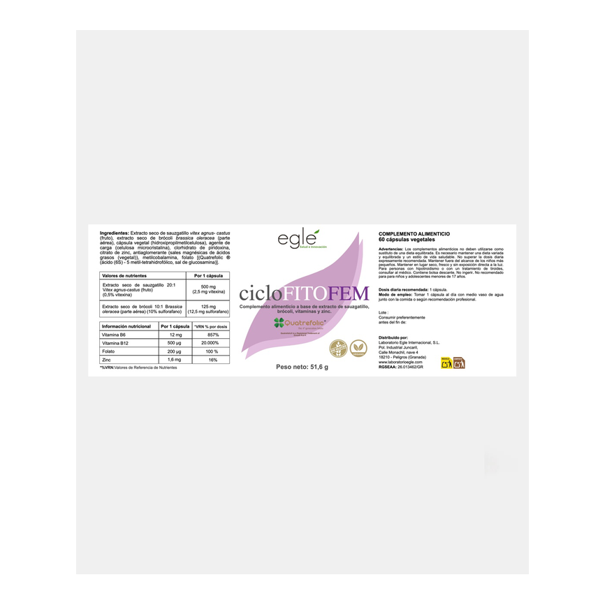 EAN: 686-0008Extracto seco de sauzgatillo vitex agnus- castus (fruto), extracto seco de brócoli brassica oleracea (parte aérea), cápsula vegetal (hidroxipropilmetil...... leer másAñadir al carritoCICLOFITOFEM 60cap. EGLEExtracto seco de sauzgatillo vitex agnus- castus (fruto), extracto seco de brócoli brassica oleracea (parte aérea), cápsula vegetal (hidroxipropilmetilcelulosa), agente de carga (celulosa microcristalina), clorhidrato de piridoxina, citrato de zinc, antiaglomerante (sales magnésicas de ácidos grasos (vegetal)), metilcobalamina, folato [(Quatrefolic ® (ácido (6S) – 5 metil-tetrahidrofólico, sal de glucosamina)].