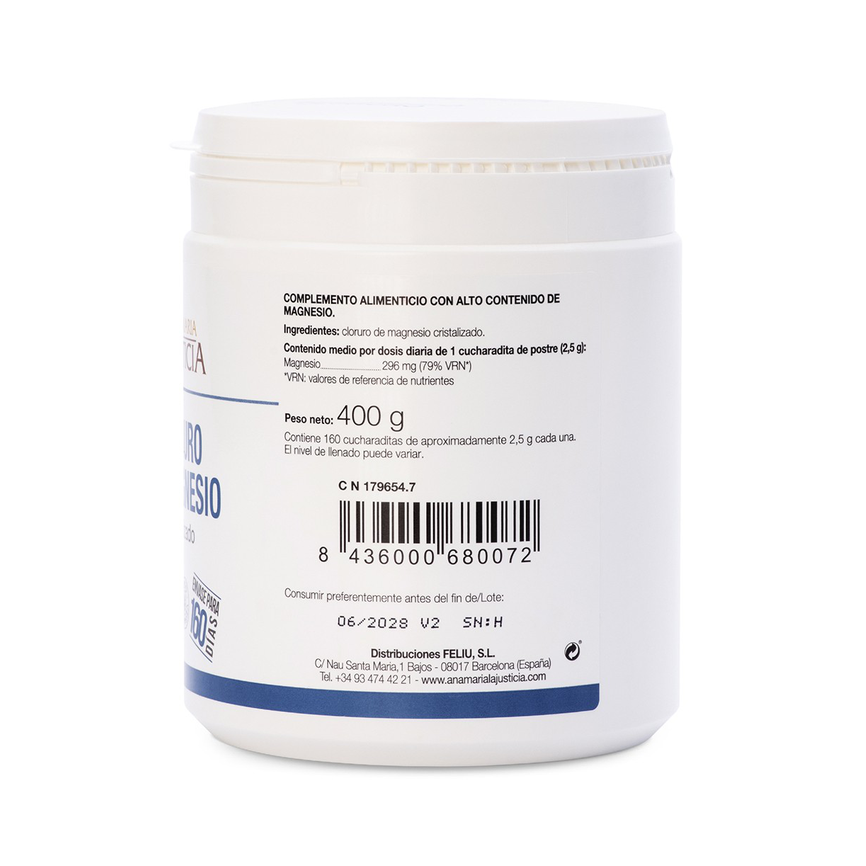 EAN: 8436000680072Cloruro de Magnesio 400 gr. Disminuye el cansancio y la fatiga y mejora el funcionamiento del sistema nervioso y musculo-esquelético. Con efecto laxante alto. El magnesio ayuda a d...... leer másAñadir al carritoCLORURO DE MAGNESIO (400 gr) - Cristalizado. ANA MARIA LA JUSTICIACloruro de Magnesio 400 gr. Disminuye el cansancio y la fatiga y mejora el funcionamiento del sistema nervioso y musculo-esquelético. Con efecto laxante alto.