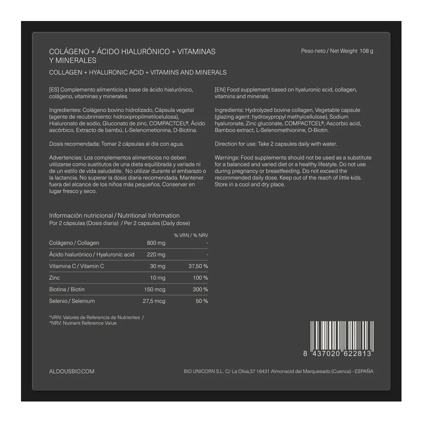 COLAGENO + ACIDO HIALURONICO, VITAMINA C, BIOTINA, ZINC, SELENIO 150caps. ALDOUS