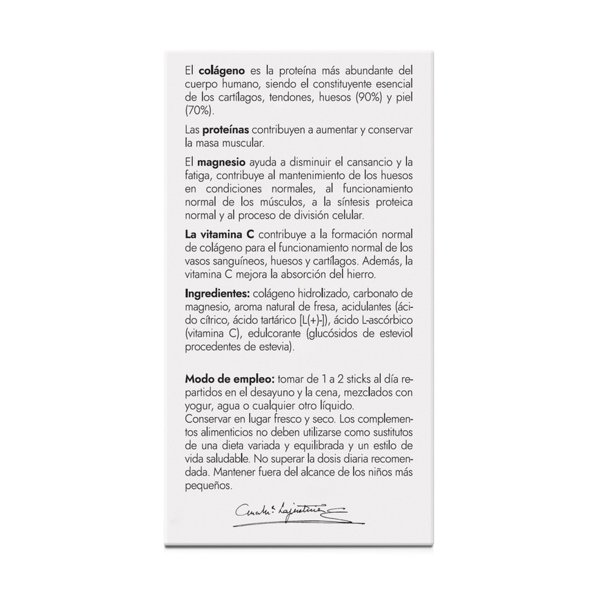- 2 sticks (10 g): colágeno hidrolizado 7,2 g, magnesio 346 mg (92% VRN*) y vitamina C 78 mg (98% VRN*).