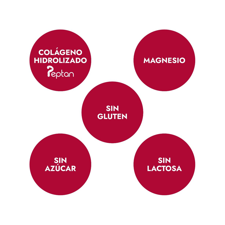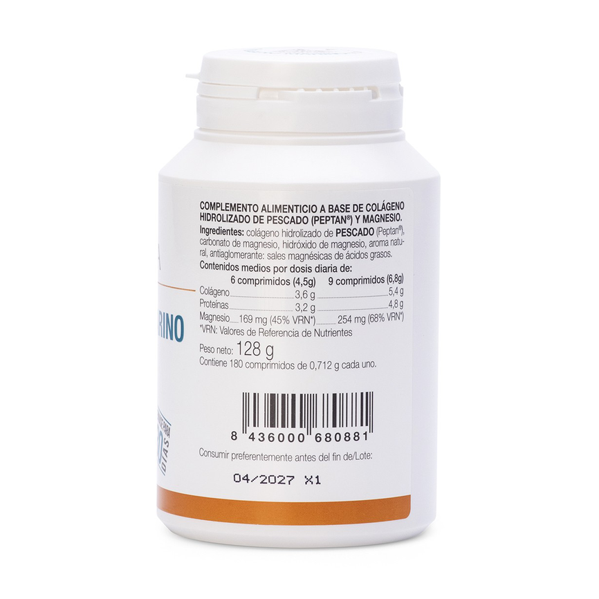 - 9 comprimidos (6,8 g): colágeno hidrolizado 5,4 g, magnesio 254 mg (68% VRN*).