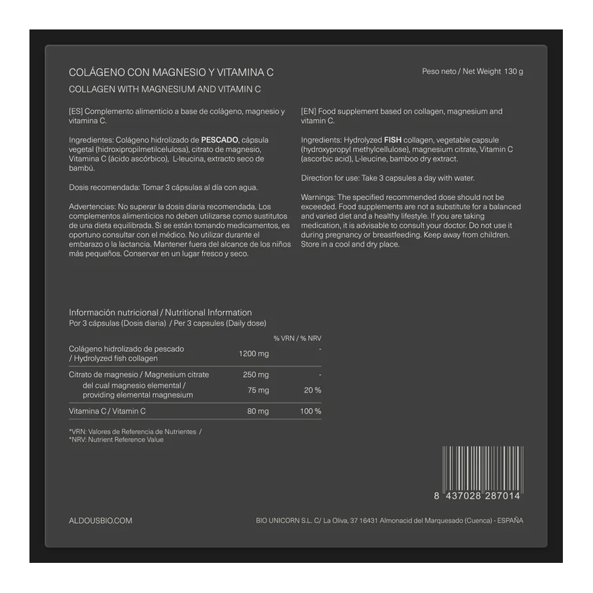 Nutriente Valor VRN Colágeno hidrolizado de pescado 1200 mg Citrato de magnesio 250 mg - del cual magnesio elemental 75 mg 20% Vitamina C 80 mg 100% VRN (Valor de Referencia de Nutriente) indica la cantidad diaria recomendada para evitar carencias, no representa un límite máximo de seguridad. Superar el 100% del VRN no implica ningún riesgo, siempre que las cantidades estén dentro de los márgenes establecidos por las autoridades sanitarias.