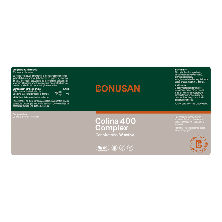 Colina 400 mg de Bonusan es para ti si tienes dudas sobre si estás tomando suficiente colina a través de tu alimentación. Por ejemplo, cuando estás embarazada, si das el...... leer másAñadir al carritoCOLINA 400 COMPLEX 90comp. BONUSANColina 400 mg de Bonusan es para ti si tienes dudas sobre si estás tomando suficiente colina a través de tu alimentación. Por ejemplo, cuando estás embarazada, si das el pecho, si no comes productos animales, si sigues una dieta pobre en grasas o comes muchos azúcares añadidos. Con Colina 400 mg de Bonusan tienes la seguridad de haber acertado.