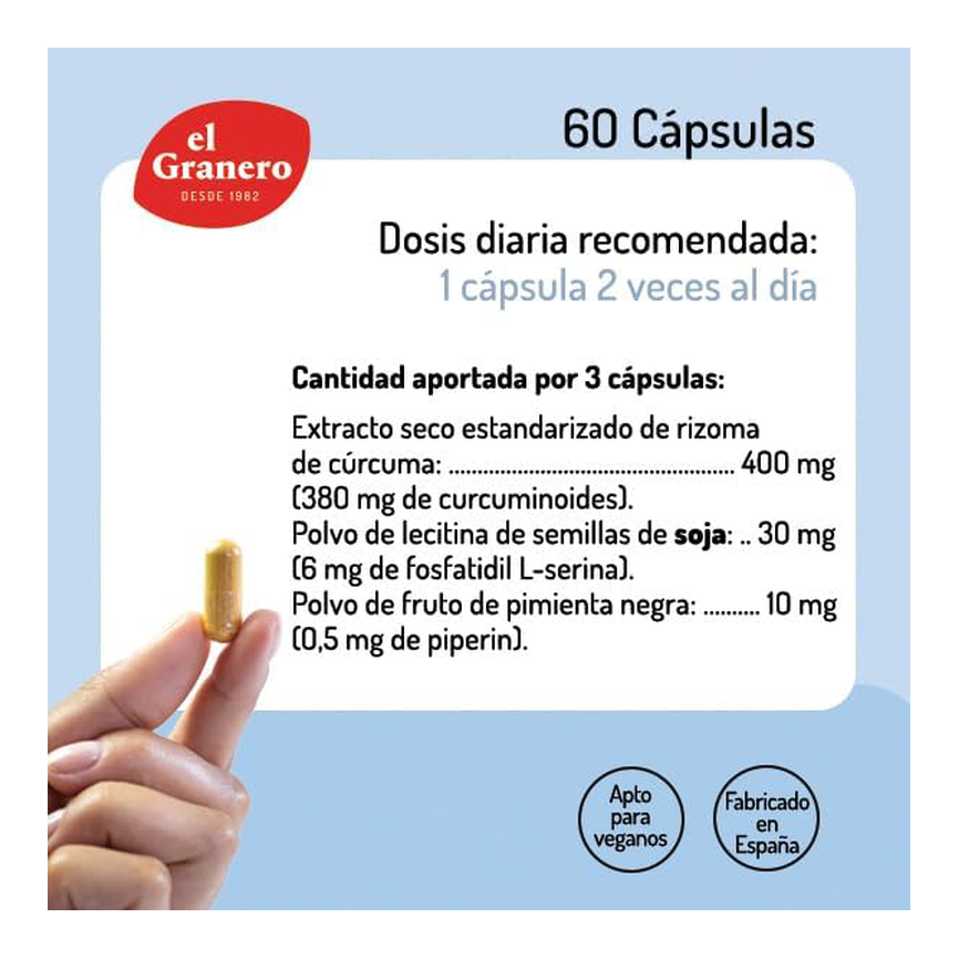 Composición:Extracto seco estandarizado de rizoma de cúrcuma (Cúrcuma Longa L.) con un mínimo del 95% en curcuminoides, agente de recubrimiento: hidroxipropilmetilcelulosa, agente de carga celulosa microcristalina, polvo de lecitina de semillas de soja (Glycine max(L.)Merr.) con un mínimo del 20% en fosfatidil L-serina, antiaglomerante sales magnésicas de ácidos grasos y polvo de fruto de pimienta negra (Piper nigrum) con un mínimo del 5% en piperina.