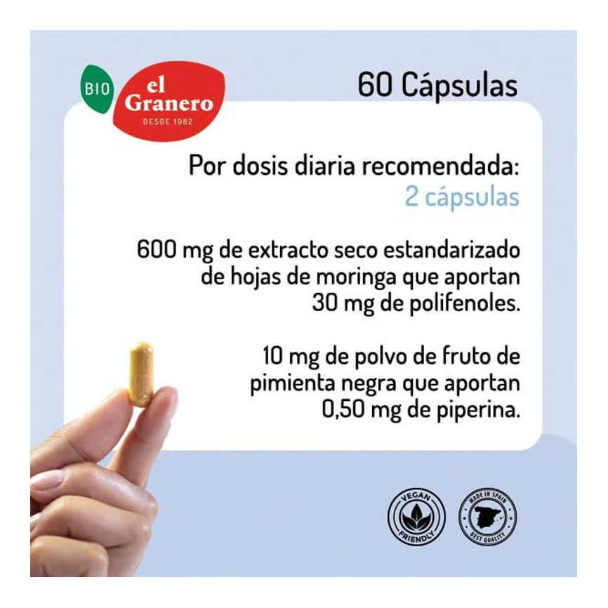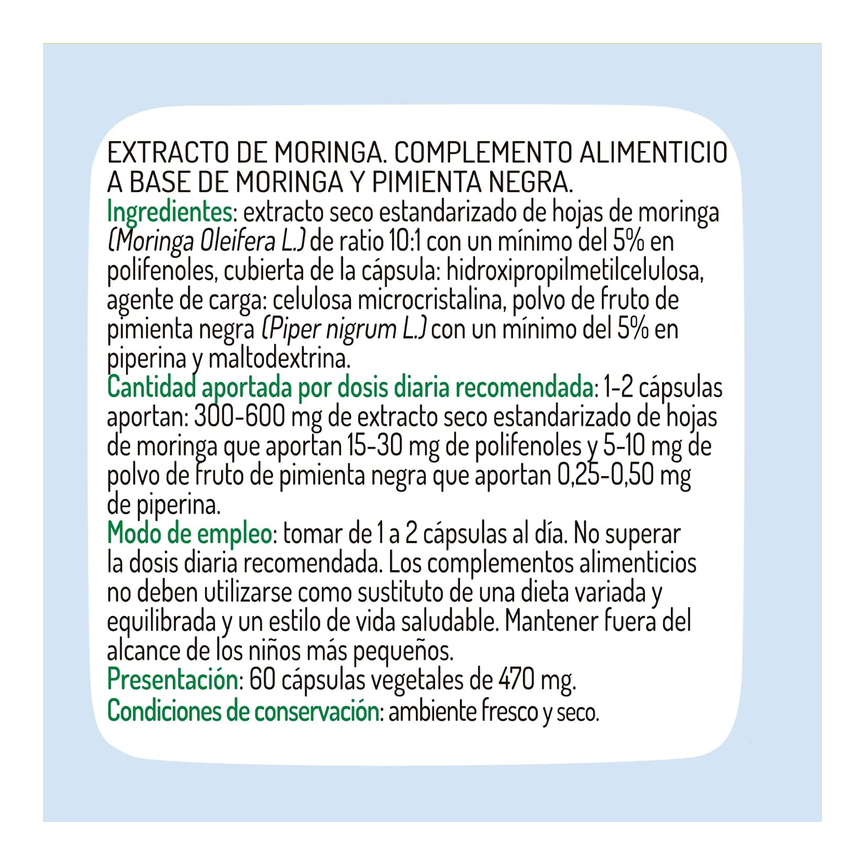 Composición:extracto seco estandarizado de hojas de moringa (Moringa Oleifera L.) de ratio 10:1 con un mínimo del 5% en polifenoles, agente de recubrimiento: hidroxipropilmetilcelulosa, agente de carga: celulosa microcristalina, polvo de fruto de pimienta negra* (Piper nigrum L.) con un mínimo del 5% en piperina y maltodextrina.