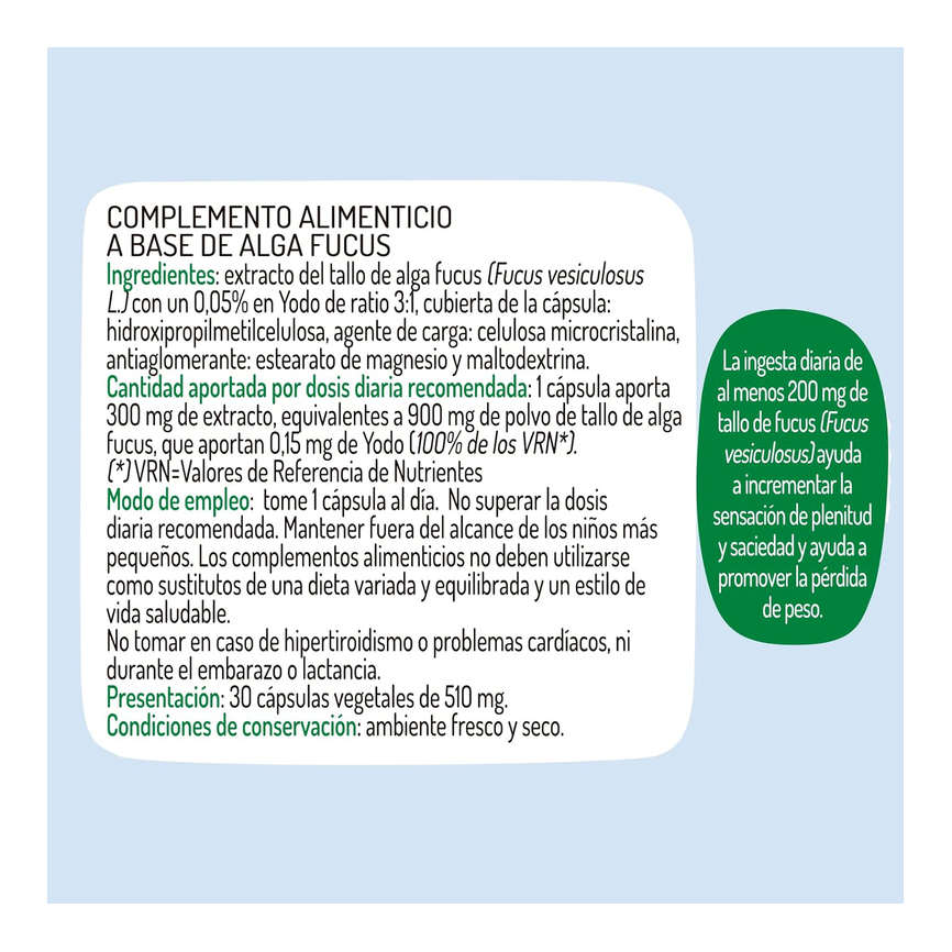 El fucus pertenece a la familia de las algas pardas. En ellas el color verde de la clorofila ha sido enmascarado por otros pigmentos que le dan color marrón. Su composición destaca por su gran contenido en minerales, sobre todo yodo y vitaminas B y C, además de tirosina. También se encuentran el ácido algínico, alginatos de sodio y betacaroteno.Modo de empleo: tome 1 cápsula al día. No superar la dosis diaria recomendada. Los complementos alimenticios no deben utilizarse como sustituto de una dieta variada y equilibrada y un estilo de vida saludable. Mantener fuera del alcance de los niños más pequeños.