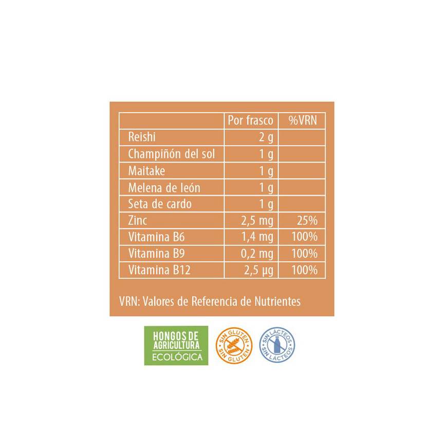 Por frasco (25 ml) % VRN* Reishi 2 g Champiñón del Sol 1 g Maitake 1 g Melena de León 1 g Seta de cardo 1 g Zinc 2,5 mg 25% Vitamina B6 1,4 mg 100% Vitamina B9 200 μg 100% Vitamina B12 2,5 μg 100% *Valores Referencia Nutrientes