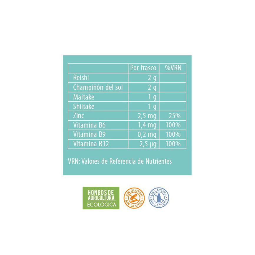 %VRN* Reishi 2 g Champiñón del Sol 2 g Maitake 1 g Shiitake 1 g Zinc 2,5 mg 25% Vitamina B6 1,4 mg 100% Vitamina B9 200 μg 100% Vitamina B12 2,5 μg 100% *Valores Referencia Nutrientes