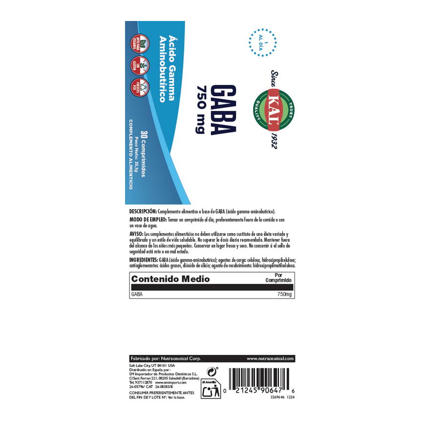 Composición:GABA (ácido gamma-aminobutírico); agentes de carga: celulosa, hidroxipropilcelulosa; antiaglomerantes: ácidos grasos, dióxido de silicio; agente de recubrimiento: hidroxipropilmetilcelulosa.