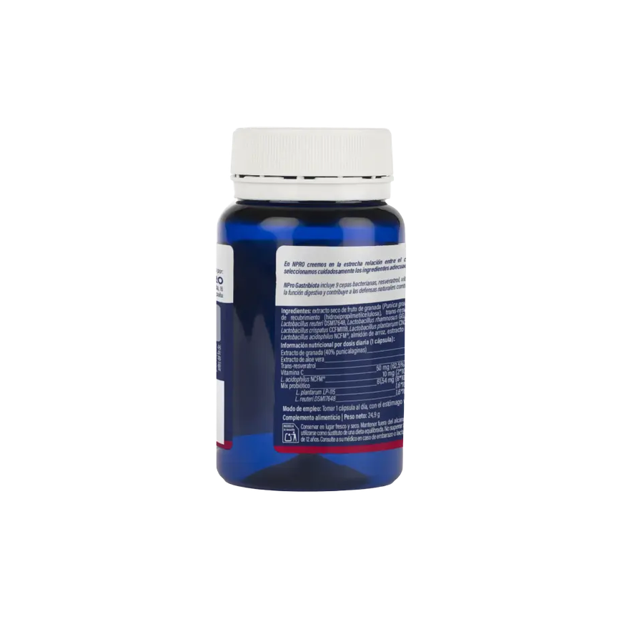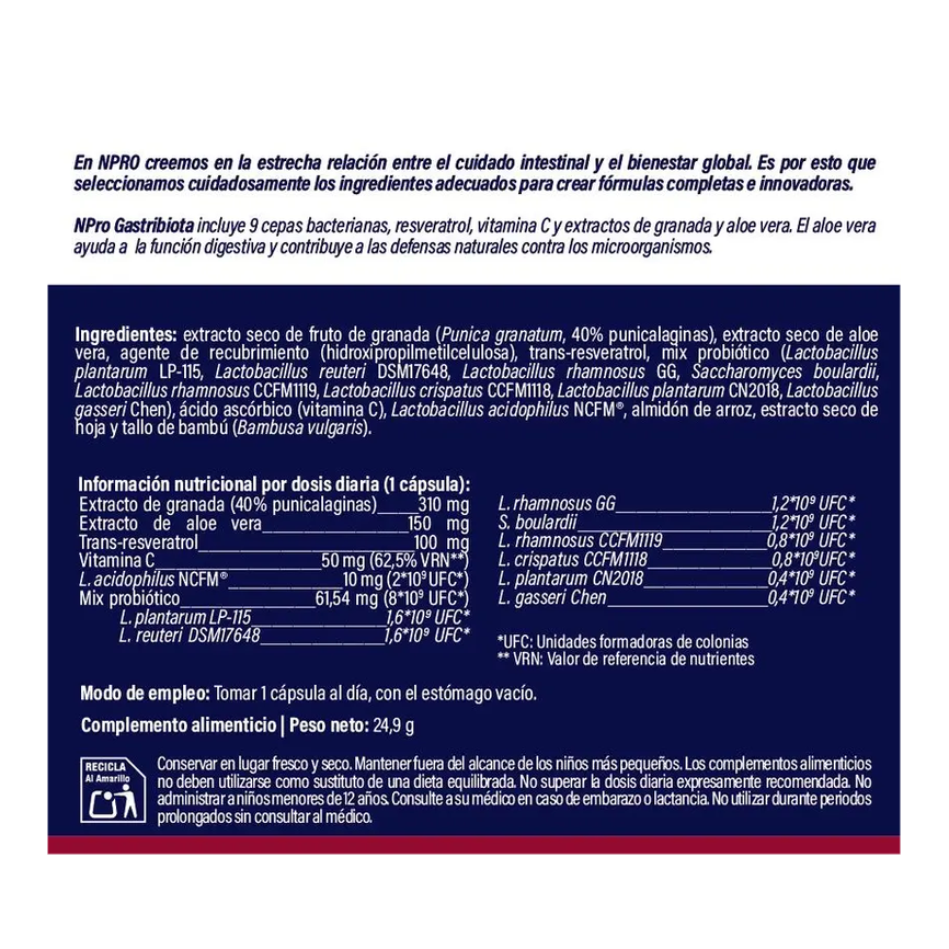 NPro Gastribiota Dosis por 1 cápsula Extracto de granada (40% punicalaginas) 310 mg Extracto de aloe vera 150 mg Trans-resveratrol 100 mg Vitamina C 50 mg (62,5% VRN**) L. acidophilus NCFM® 10 mg (2x109 UFC*) Mix probiótico 61,54 mg (8x109 UFC*) L. plantarum LP-115 1,6x109 UFC* L. reuteri DSM17648 1,6x109 UFC* L. rhamnosus GG 1,2x109 UFC* S. boulardii 1,2x109 UFC* L. rhamnosus CCFM1119 0,8x109 UFC* L. crispatus CCFM1118 0,8x109UFC* L. plantarum CN2018 0,4x109 UFC* L. gasseri Chen 0,4x109 UFC* Bambú Cápsula vegetal Almidón de arroz *UFC: Unidades formadoras de colonias ** VRN: Valor de referencia de nutrientes