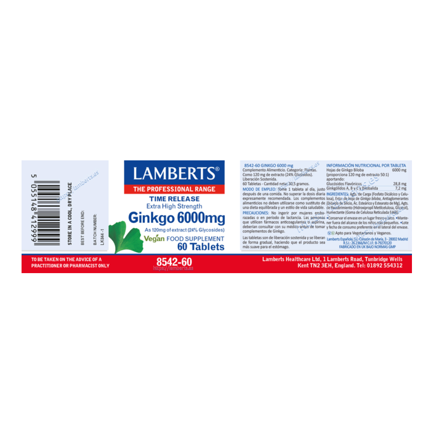 GINKGO BILOBA 6000 Alta Potencia 120 MG. 60 comp. LAMBERTS