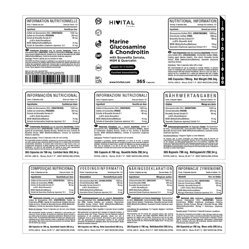 LA MEJOR GLUCOSAMINA MARINA CON CONDROITINA elaborada con Sulfato de Glucosamina 2KCL (procedente de crustáceos) 1500 mg, Sulfato de Condroitina (procedente de pescado azul) 300 mg, Extracto de Boswellia Serrata 6:1 (65% de Ácido Boswélico) 90 mg, MetilSulfonilMetano (MSM) 75 mg, Extracto de Quercetina 15:1 (Sophorae Japonica) 15 mg.