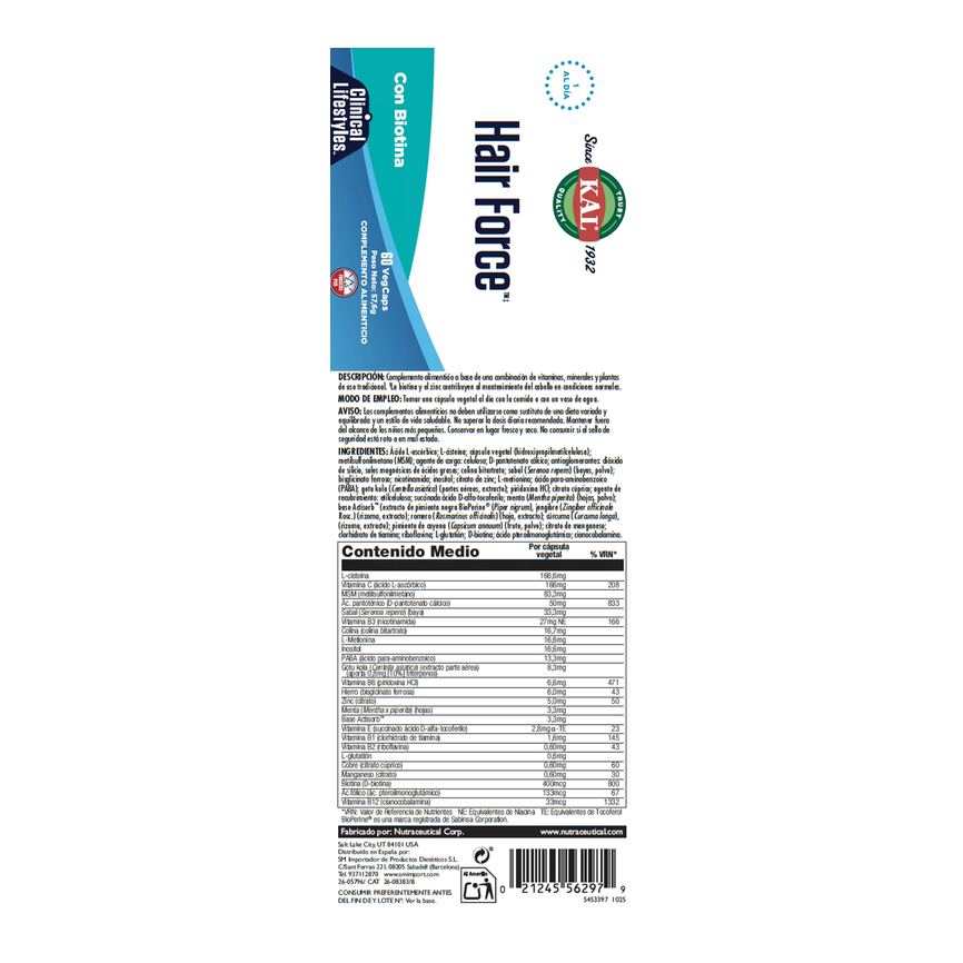 HAIR FORCE - 60 VEGCAPS Complemento alimenticio a base de una combinación de vitaminas, minerales y plantas de uso tradicional. ‡La biotina y el zinc contribuyen al mantenimie...... leer másAñadir al carritoHAIR FORCE 60cap. KAL SOLARAYHAIR FORCE - 60 VEGCAPS