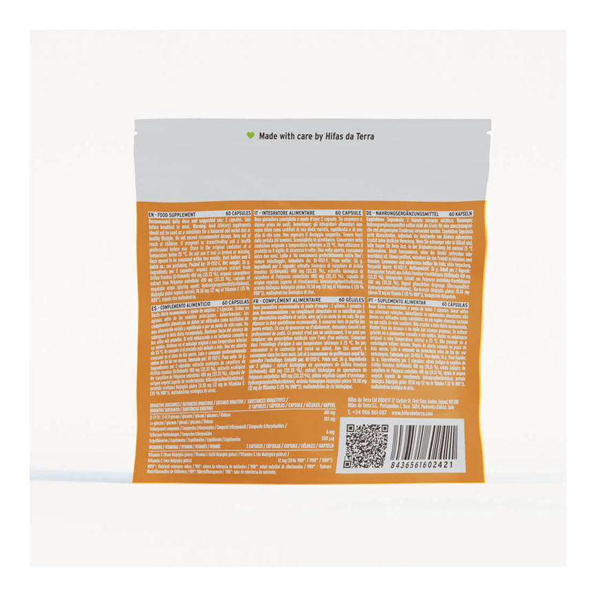 Suplemento alimenticio. 60 cápsulas (600 mg) de extractos puros estandarizados de Hifas da Terra seleccionados a partir de cepas únicas que cuentan con los mejores resultados analíticos. Cada cápsula contiene 200 mg de extracto ecológico HdT de Maitake (Grifola frondosa T1178- Grifolumib®), 200 mg de extracto ecológico HdT de Polyporus (Polyporus umbellatus T1666) y 35.29 mg de polvo orgánico de acerola (Malpighia glabra).