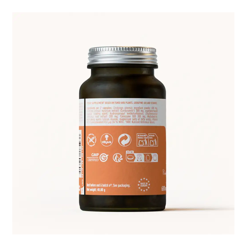 Ingredientes por 2 cápsulas del suplemento para la energía: polvo de micelio de Cordyceps sinensis 400 mg, extracto de micelio de Cordyceps sinensis (Cordyzumib®) 300 mg, cápsula de origen vegetal (agente de recubrimiento: hidroxipropilmeticelulosa), extracto de raíz de Eleuterococcus senticosus (Ginseng siberiano) 200 mg, Coenzima Q10 100 mg, Maltodextrina, antiaglomerantes (dióxido de silicio, sales magnésicas de ácidos grasos), Vitamina B12 (Cianocobalamina) 0,4 g (16 % VRN). *VRN: Valores de referencia de nutrientes * Contiene vitamina B12 que contribuye a disminuir el cansancio y la fatiga.