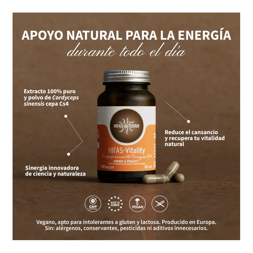 Hifas-Vitality Energía y Cansancio SUPLEMENTO ENERGIZANTE: *REDUCE LA FATIGA Y EL CANSANCIO Hifas-Vitality te ayuda a recuperar la vitalidad que echas en falta y actú...... leer másAñadir al carritoHIFAS-VITALITY Energía y Cansancio bote 60caps. HIFAS DA TERRAHifas-Vitality Energía y Cansancio