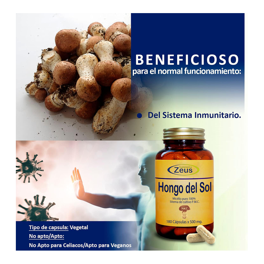 EAN: ZE-03402Descripción: Complemento alimenticio a base de Hongo del Sol y Vitamina C. El Hongo del Sol (Agaricus blazei Murill) es conocido por ser un poderoso estimulante del sistema inmunitario ...... leer másAñadir al carritoHONGO DEL SOL 180cap. ZEUSDescripción: Complemento alimenticio a base de Hongo del Sol y Vitamina C. El Hongo del Sol (Agaricus blazei Murill) es conocido por ser un poderoso estimulante del sistema inmunitario promoviendo los mecanismo de defensa natural. La vitamina C contribuye al funcionamiento normal del sistema inmune.