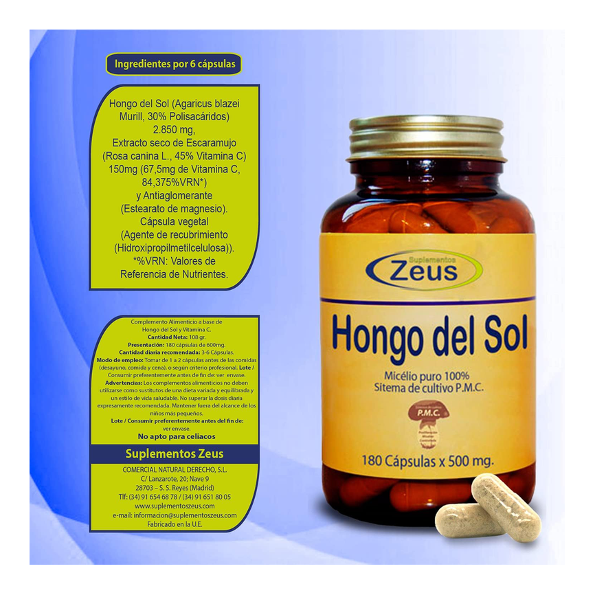 Hongo del Sol (Agaricus blazei Murill, 30% Polisacáridos), Cápsula vegetal [Agente de recubrimiento (Hidroxipropilmetilcelulosa)], Extracto seco de Escaramujo (Rosa canina L., 45% Vitamina C), Antiaglomerante (Estearato de magnesio).