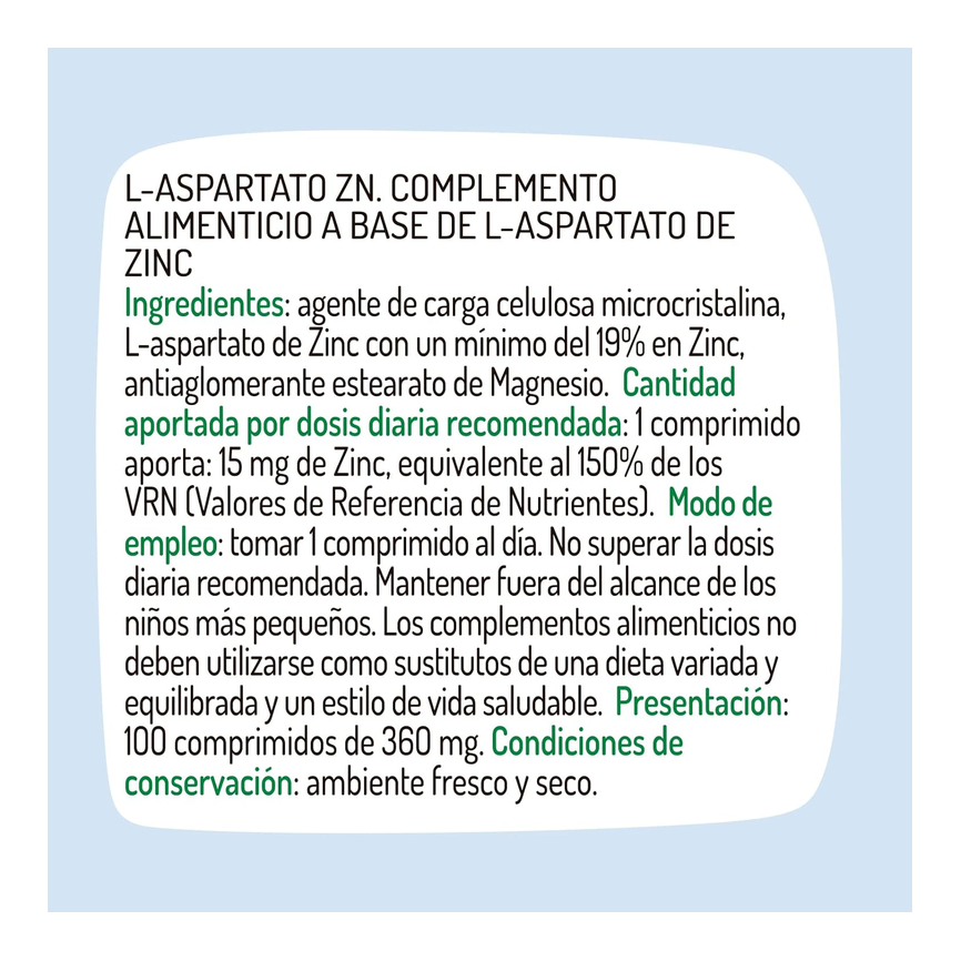 Composición:Agente de carga celulosa microcristalina, L-aspartato de Zinc, antiaglomerante estearato de Magnesio.