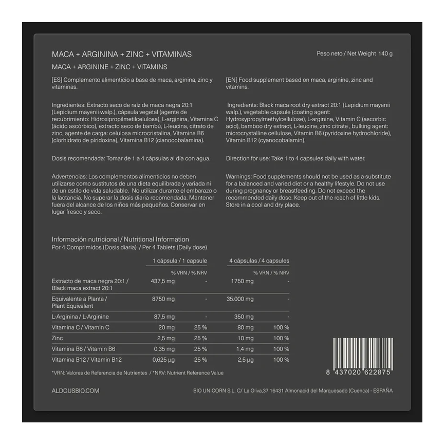 Nutriente Valor VRN Extracto de maca negra 20:1 437,5 mg Equivalente a Planta 8750 mg L-Arginina 87,5 mg Vitamina C 20 mg 25% Zinc 2,5 mg 25% Vitamina B6 0,35mg 25% Vitamina B12 0,625 μg 25% 4 cápsulas por dosis diaria.