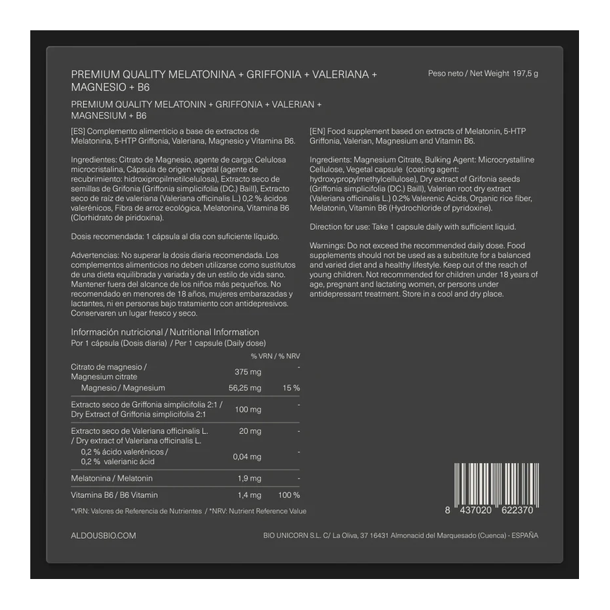 MELATONINA CON MAGNESIO, GRIFFONIA, VALERIANA Y VITAMINA B6 250caps. ALDOUS